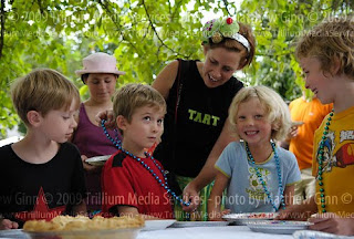 On the appointed day, we arrived fashionably late to find the party in full swing. Judging for the pie decorating contest was under way (right), followed by a live demonstration on how to properly throw a pie (your choice of cream—shaving or whipped). Then the real fun began as kids (young and not-so-young) had the opportunity to throw their creations at one another.